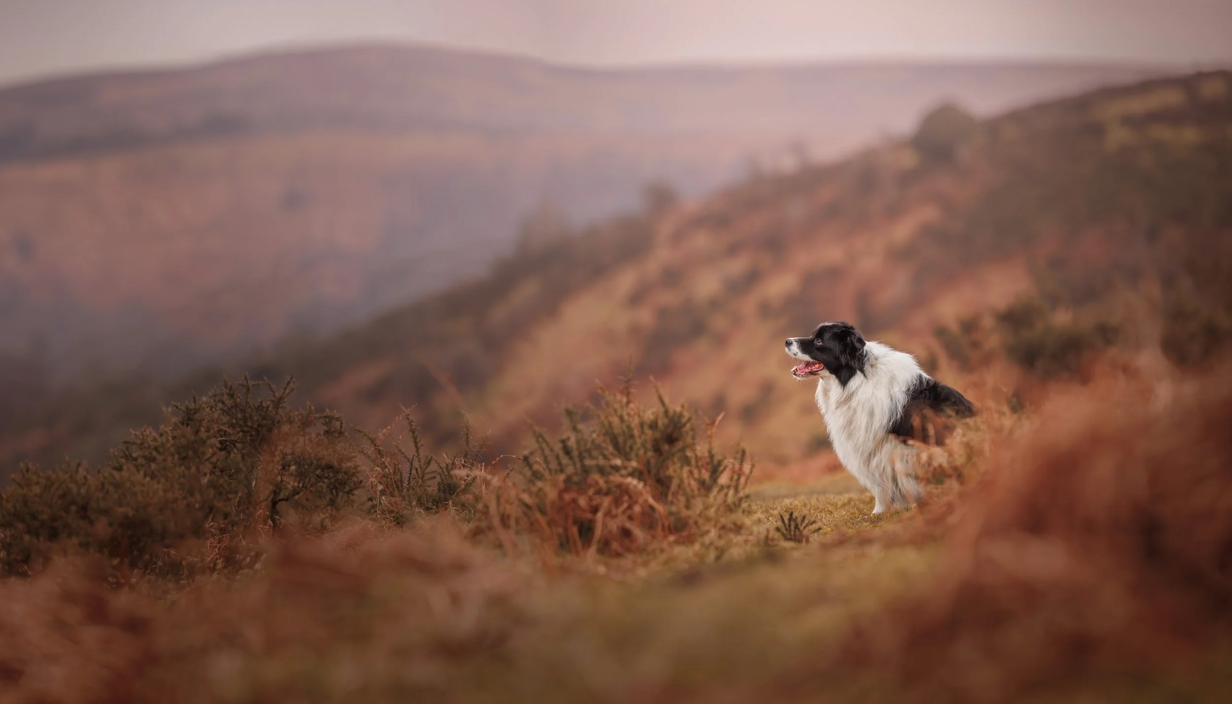Wolfie & Lil Photography, Devon & Dorset dog photographer - A black and white border collie standing among brownish-red bushes in a hilly Dartmoor landscape with a blurred background of rolling hills.